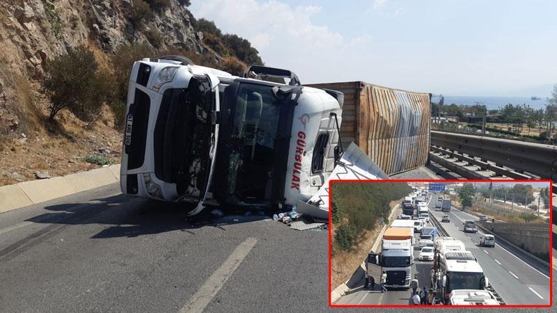 Kocaeli’nin Körfez ilçesinde devrilen yağ yüklü TIR’ın araçta sıkışan sürücüsü yaralandı. Kaza nedeniyle kapanan yolda uzun araç kuyrukları oluştu.