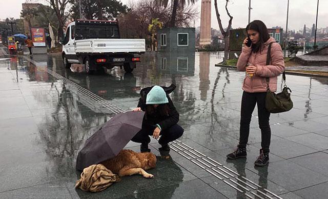 Cumhuriyet Meydanı'na gezmeye gelen 2 genç kız, yağmurda ıslanan sokak köpeğini görünce hemen yanına gitti. Kızlar, sırılsıklam olan köpeği, ellerindeki şemsiyeyi üzerine tutarak yağmurdan korumaya çalıştı. Vatandaşlar da o anları cep telefonlarıyla görüntüleyerek, sosyal medyada paylaştı. Görüntüde, şemsiyenin altında uzun süre yatan köpek daha sonra kalkıp, meydandan ayrılıyor. Yürürken de sık sık geri dönüp, 2 genç kıza bakıyor.