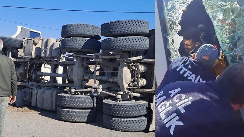 Yan yatan kamyonda yaralanan sürücüyü camdan çıkardılar
