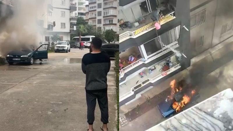 Mezitli ilçesi Menderes Mahallesi'nde bir binanın önüne park edilen N.E.'ye ait 33 A 4155 plakalı otomobil, birden alev aldı. Bu sırada binanın 3'üncü kat balkonundaki kişi, su dolu kova ile alevlere müdahale etmeye çalıştı. O anlar kameraya yansırken, bölgeye itfaiye ekipleri gönderildi. Ekipler alevleri söndürürken, araç kullanılamaz hale geldi.