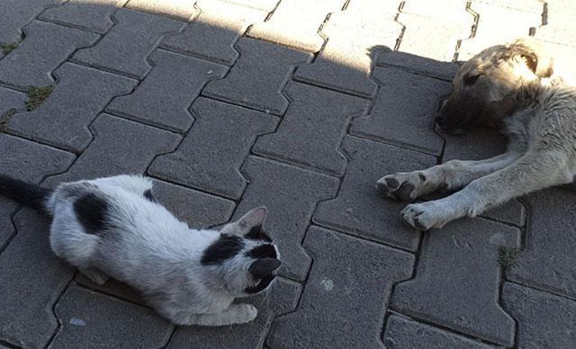 Yavru kedi ile köpeğin dostluğu hayran bıraktı