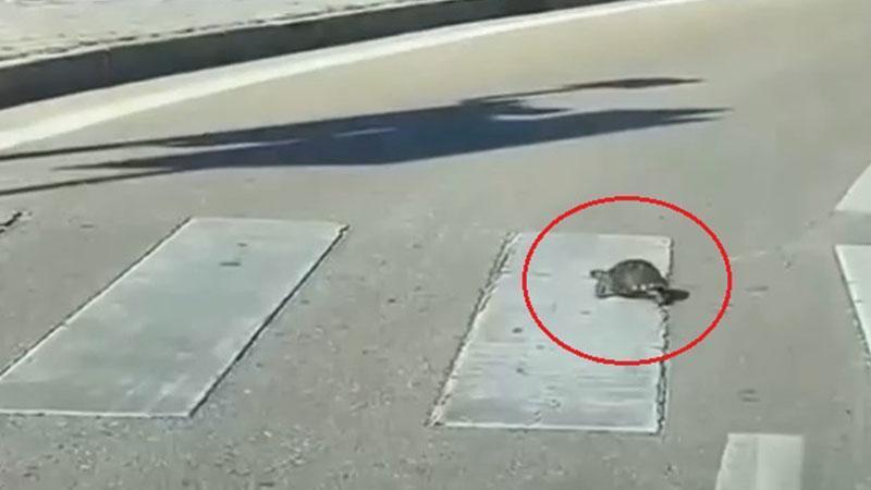 Yaya geçidinden geçen kaplumbağa, kamerada