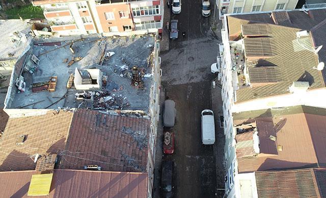 Gaziosmanpaşa Karadeniz Mahallesi’nde dün akşam saatlerinde etkili olan fırtınada binanın çatısının tamamı uçtu. Uçan çatı çevre binalara, yolda park halindeki araçlara da zarar verdi. Binalardaki hasar havadan da görüntülendi.