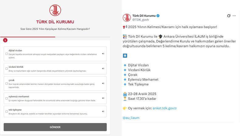 TDK'den yapılan açıklamaya göre, geçen ay Ankara Üniversitesi İletişim Araştırmaları ve Uygulama Merkezi (İLAUM) iş birliğiyle '2025 Yılının Kelimesi/Kavramı'nı belirlemek için öneri süreci başlatıldı. Bu kapsamda, Değerlendirme Kurulu ve halktan gelen önerilerin değerlendirilmesiyle belirlenen 5 kelime/kavram halkın oylamasına açıldı. Bu kelime/kavramlar 'dijital vicdan, vicdani körlük, çorak, eylemsiz merhamet ve tek tipleşme' oldu. 22 Aralık'ta başlayan oylama süreci 28 Aralık 2025'te saat 17.30'da sona erecek. Oylamaya katılmak isteyenler, Türk Dil Kurumunun genel ağ sayfasında yer alan 'https://anket.tdk.gov.tr/' bağlantı üzerinden oy kullanabilecek.