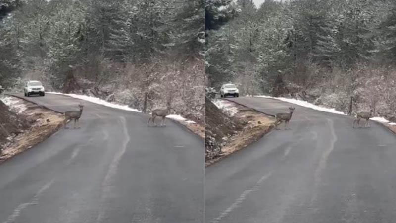Karabük'ün Ovacık ilçesinde ormandan yola inen 2 karaca, Orman İşletme Müdürlüğü ekipleri tarafından cep telefonu kamerasıyla görüntülendi.
