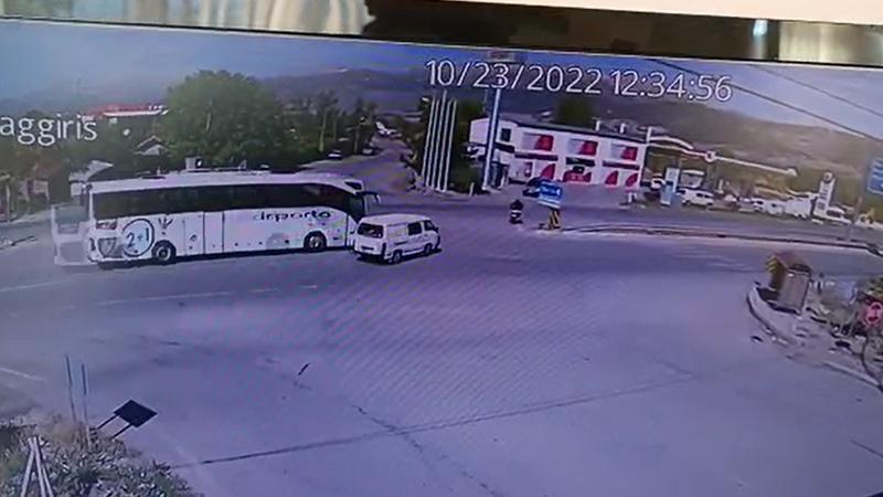 Kaza ise güvenlik kamerasına yansıdı. Görüntülerde seyir halindeki yolcu otobüsünün, aynı istikametteki minibüsün ana yola çıkmaya çalıştığı sırada çarpışmaları yer alıyor.