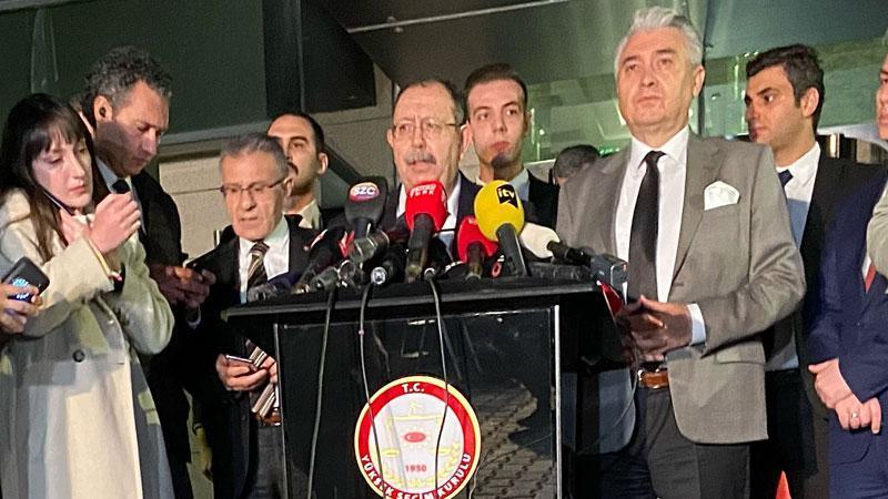 YSK Başkanı Ahmet Yener, oy sayımı sürerken YSK önünde açıklamada bulundu. Yener, YSK’nın veri girişinde herhangi bir aksama ya da gecikme söz konusu olmadığını belirterek, "Verilerimiz anlık olarak siyasi partilerimizle de paylaşılmaktadır. Bilindiği gibi cumhurbaşkanı adayı sayısı 4, 24 tane de siyasi partimiz seçimlere katılmaktadır. Sandık alanlarından gelen seçim sonuçları ilçe seçim kurullarına, ilçe seçim kurullarından da il seçim kurullarına intikali oluyor ve bu şekilde de sisteme girişi söz konusu olmaktadır. Şu an itibarı ile yurt içinde yüzde 47.08, yurt dışında ise 12.60 oy girişi gerçekleşmiştir. Gecikme durumunda da nasıl bir yol izleneceği hem kanunda hem de seçim takviminde işlenmiştir" dedi.