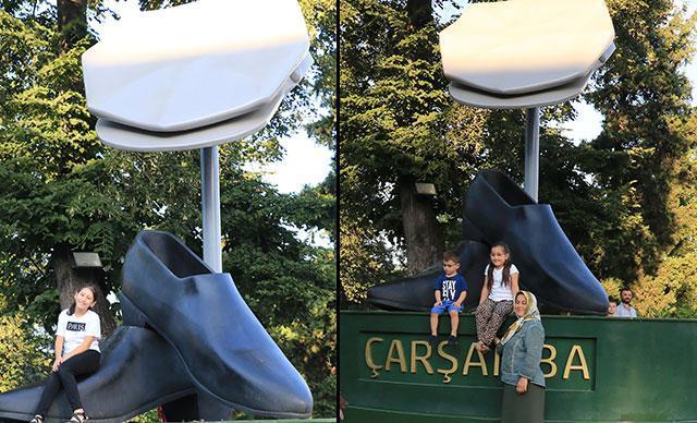 Samsun’un Çarşamba ilçesinde, yöre simgelerinden olan 8 köşe kasket ile yumurta topuk ayakkabının dikilen heykeli, yoğun ilgi görüyor.