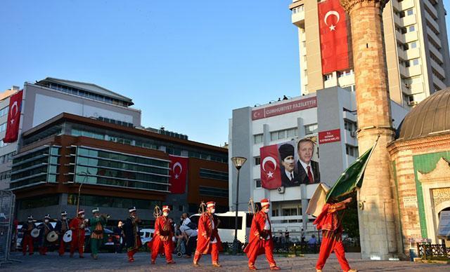 İzmir'de, 15 Temmuz darbe girişiminin dördüncü yılında Konak Meydanı'nda anma töreni düzenlendi. Tören, mehteran takımının İZSU binasından Konak Meydanı'na yürüyüşüyle başladı.