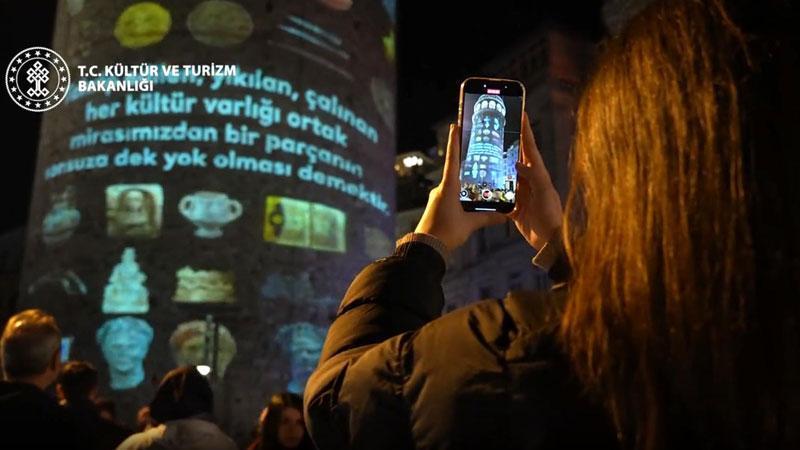 Galata Kulesi'nin silueti üzerinde ışık yansıtmasıyla kültür varlığı kaçakçılığına karşı toplumsal duyarlılığın artırılmasına yönelik mesaj verildi. Bakanlığın yürüttüğü çalışmalarla yurt dışından ülkeye iadesi sağlanan bazı önemli eserlerin görselleri Galata Kulesi'ne yansıtıldı. Bakan Ersoy, Galata Kulesi'ndeki ışıklandırmanın videosunu NSosyal hesabından paylaşarak, yurt dışına kaçırılan kültür varlıklarının iadesine ilişkin güncel rakamları açıkladı.