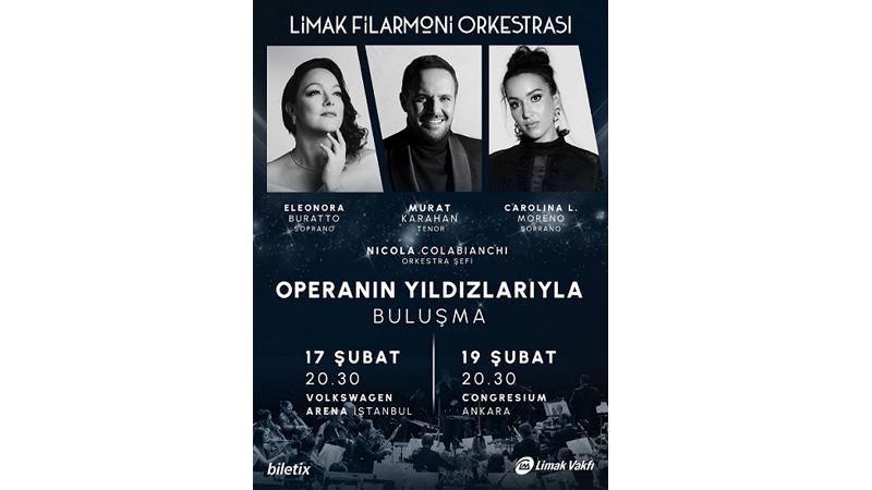Çok sesli müziği geniş kitlelere ulaştırmayı amaçlayan Limak Filarmoni Orkestrası, yeni yıl konserleri serisinin ilkini 17 Şubat’ta İstanbul Volkswagen Arena’da, ikinci konseri ise 19 Şubat’ta Ankara Congresium’da gerçekleştirecek. Konserlerde, dünya çapında birçok büyük operada başrolleri seslendiren ve Berlin Staatsoper, Berlin Deutscheoper, Münih Bayerische Staatsoper, Wiener Staatsoper, Arena di Verona, Napoli Teatro di San Carlo, Bolshoi Theatre, Wiener Staatsoper gibi sahnelerde adından söz ettiren ünlü tenor Murat Karahan, uluslararası opera sahnelerinin yıldızı, özellikle Verdi operalarındaki performanslarıyla tanınan lirik soprano Eleonora Buratto ve genç yaşına rağmen uluslararası ödüllerle başarısını kanıtlamış ve prestijli konser salonlarında sahne almış soprano Carolina López Moreno sahne alacak.