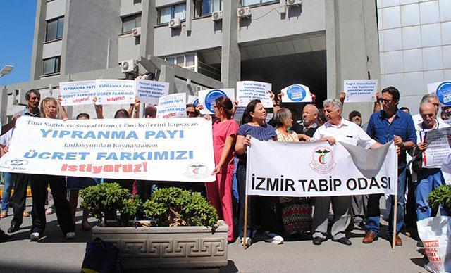 İzmir'de sağlıkçılar, Katip Çelebi Üniversitesi (KÇÜ) Atatürk Eğitim ve Araştırma Hastanesi Başhekimlik binası önünde, ortak basın açıklaması yaptı. Sağlık çalışanları, torba yasayla yapılan yıpranma payına ilişkin düzenlemenin, sağlık ile sosyal hizmet emekçilerinin tamamını kapsamadığı ve geçmiş yıllardaki yıpranmışlığı yok saydığı için adil olmadığını savundu.