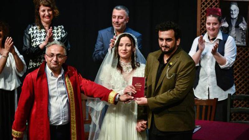 Antalya'da 13 yıl aynı tiyatro sahnesini paylaşan Çağdaş Çobanoğlu (34) ve Sinem Korola (34) çifti, tanıştıkları sahnede, kendilerinin yazıp oynadığı 'Teftiş-i Temaşa Nikah' adlı oyunda dünyaevine girdi.