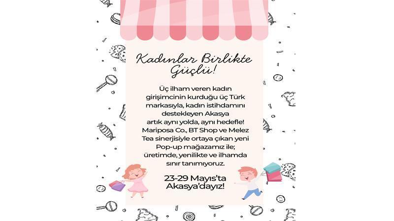 “Kadın girişimciliğini teşvik etmek amacıyla bir araya gelen Ece Sarıoğlu, Buse Terim ve Liliana Aslanoba, kendi markaları ile Akasya’da çok özel bir pop-up mağaza deneyimi yaratıyor. 23 Mayıs’ta kapılarını açacak bu alan, özenle seçilmiş bebek ve çocuk ürünleriyle, stil ve tasarımın öne çıktığı alternatif bir alışveriş deneyimi sunacak.