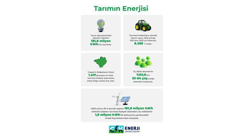 İklim değişikliğinin etkisi ile son yıllarda yenilenebilir enerji kaynaklarının elektrik üretim ve tüketimindeki payı artarken, Tarımın Enerjisi Raporu’nda bölgede bu yöndeki gelişmelere de yer verildi. CK Enerji Çamlıbel Elektrik’in hizmet bölgesi olan Sivas, Tokat ve Yozgat’ta tarımsal faaliyet gösteren işletmeler tarafından kurulan yenilenebilir enerji santrallerinin 2025 yılının ilk 9 ayında toplam üretimi 2,5 milyon kWh’ye ulaşırken, tarımsal işletmelerin bu santrallerden tükettikleri enerji ise 1,9 milyon kWh’yi buldu.
