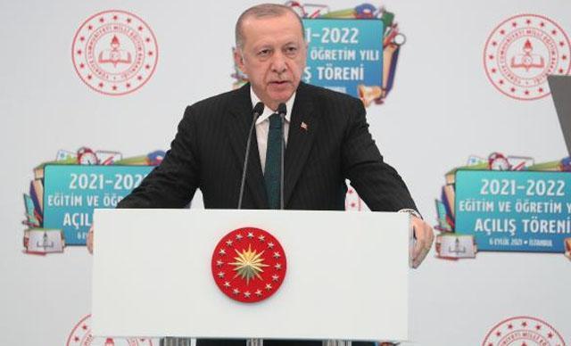 Erdoğan, bugün uzun bir aranın ardından yeniden okuluna kavuşan evlatların Türkiye'nin geleceği olduğunu ifade ederek, “Türkiye'nin başarılı bilim insanları, sanatçıları, siyasetçileri, öğretmenleri, mühendisleri yüreği kıpır kıpır atan bu gençlerimizin arasından çıkacaktır. Cumhuriyetimizin 100'üncü yılına dair büyük idealleri ve hedefleri olan insan kaynağının yetiştiği fidanlık, bu okullarımızdır. Türkiye'yi muasır medeniyetler seviyesi üzerine ancak kaliteli, özgün, en modern teknolojiyle donanmış bir eğitim-öğretim sistemiyle taşıyabiliriz. Bunun için eğitime harcadığımız her bir kuruşu ülkemizin geleceğine yapılmış bir yatırım olarak değerlendiriyoruz. Göreve geldiğimiz 2002 yılından beri eğitimi daima en öncelikli meselemiz olarak gördük. 2002 yılında MEB bütçesi, sadece 7,5 milyar lira iken, 2021 yılında bu rakam 147 milyar liraya yükselmiştir. Yüksek öğretimi de dahil ettiğimiz de eğitim bütçemiz 211 milyar lirayı aşıyor. Anne babalar okullar açılınca, ders kitabı peşinde koşmasın diye okul kitaplarını ücretsiz dağıtıyoruz. Bakın biz, teksir kağıtlarıyla hazırlanmış kitaplardan okulumuzu okumayı, onlar da tabi, o teksir makinesinin mürekkebiyle rezil hale gelirdi. Abilerimizden onları isterdik vermezlerdi. Parayla vermezlerdi. Biz bunu yaşadığımız için yeni nesil bunu yaşamasın. Kuşe kağıtlarıyla kitaplarımızı hazırladık. Masaların üzerine koyduk. Ülkemiz genelindeki derslik sayısı neydi. 343 bin… Bunu nereye çıkardık. 601 bine taşıdık. Neden sınıflarımız hem kalabalık olmasın. Sınıflarımızdaki öğrenci sayısı da azalsın" dedi.