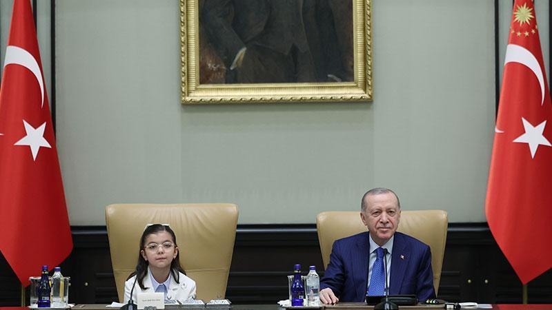 Cumhurbaşkanı Erdoğan, 23 Nisan Ulusal Egemenlik ve Çocuk Bayramı'nda Cumhurbaşkanlığı Külliyesi'nde, kabine toplantısının yapıldığı salonda Bakan Tekin ve beraberindeki çocukları kabul etti. Erdoğan, koltuğunu Hacı Mustafa Tarman Ortaokulu'nda 4'üncü sınıf öğrencisi İpek Vera Yolcu'ya bıraktı. Cumhurbaşkanı Erdoğan, tüm çocukların 23 Nisan Milli Egemenlik ve Çocuk Bayramı'nı kutlayarak, 23 Nisan'ın milletçe büyük bir coşkuyla kutlandığını söyledi. Erdoğan, "Vatanımız, bağımsızlığımız, istikbalimiz uğruna canını veren şehitlerimizi bugün bir kez daha rahmetle yad ediyorum. Gazi Mustafa Kemal ve silah arkadaşları başta olmak üzere, Türkiye Cumhuriyeti'nin kuruluşundan bugünlere güçlü ve özgür bir devlet haline gelmesinde emeği olan herkesi şükranla anıyorum. Her birinizin gözlerindeki heyecanı gördükçe, aydınlık yarınlarımıza olan inancımızın arttığını özellikle vurgulamak istiyorum. Her birinizin tek tek gözlerinden öpüyorum" dedi.