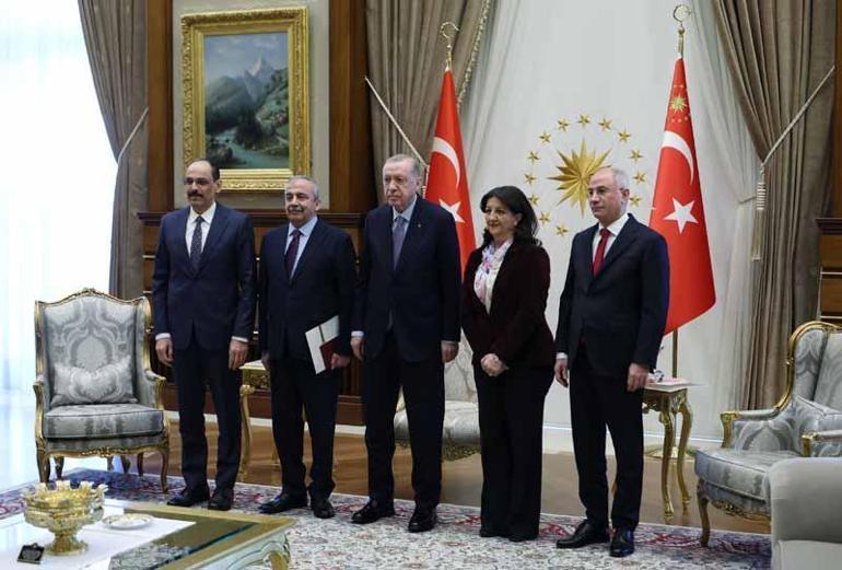 Cumhurbaşkanı Recep Tayyip Erdoğan, DEM Parti İmralı heyetinde yer alan Van Milletvekili Pervin Buldan ve İstanbul Milletvekili Sırrı Süreyya Önder'i Cumhurbaşkanlığı Külliyesi'nde kabul etti. Saat 13.30'da başlayan basına kapalı görüşmede, AK Parti Genel Başkan Vekili Efkan Ala ve Milli İstihbarat Teşkilatı (MİT) Başkanı İbrahim Kalın da yer aldı.