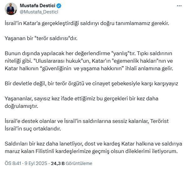 Destici, İsrail'in saldırıları bir devletin değil, bir terör örgütü ve cinayet şebekesinin faaliyetleridir. Bir devletle değil, bir terör örgütü ve cinayet şebekesiyle karşı karşıyayız. Yaşananlar, sayısız kez ifade ettiğimiz bu gerçekleri bir kez daha doğrulamıştır. İsrail'e destek olanlar ve İsrail'in saldırılarına sessiz kalanlar, terörist İsrail'in suç ortaklarıdır. Saldırıları bir kez daha lanetliyor, dost ve kardeş Katar halkına ve saldırıya maruz kalan Filistinli kardeşlerimize geçmiş olsun dileklerimi iletiyorum" açıklamasında bulundu. (DHA)