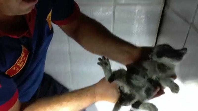 Duvara sıkışan yavru kediyi, fayansları kırıp kurtardılar