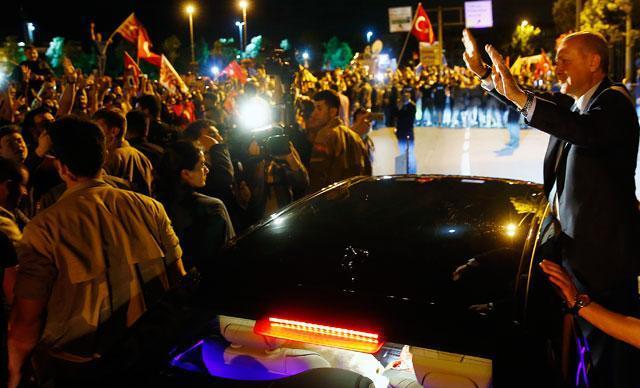 Cumhurbaşkanı Recep Tayyip Erdoğan, Ankara'ya harakete öncesi Atatürk Havalimanı'nın Askeri Apron bölümünün önünde, ellerinde AK Parti flamaları ve Türk bayraklarıyla bekleyenleri selamladı. Makam aracını durdurarak kalabağılı selamlayan Erdoğan daha sonra balkon konuşması için saat 01.00 sıralarında Ankara'ya hareket etti.