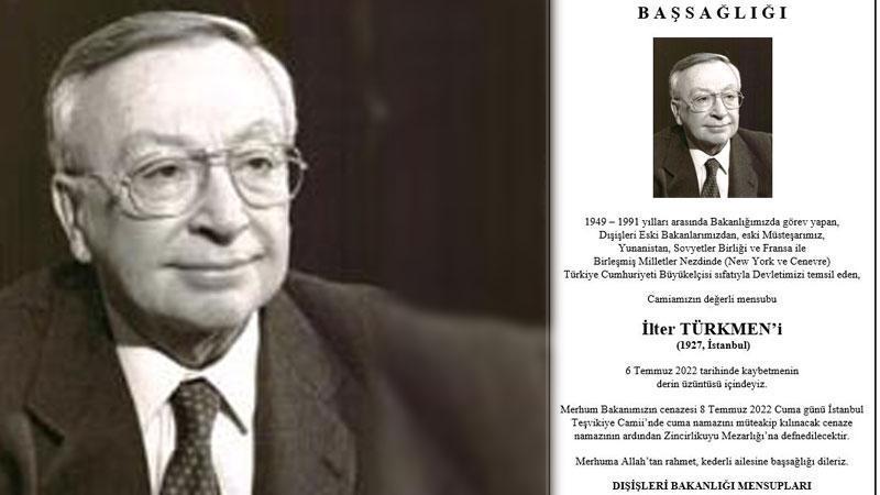 Dışişleri Bakanlığı'nca Twitter'dan paylaşılan başsağlığı mesajında, "1949-1991 yılları arasında bakanlığımızda görev yapan, Dışişleri eski bakanlarımızdan, eski müsteşarımız Yunanistan, Sovyetler Birliği ve Fransa ile Birleşmiş Milletler Nezdinde Türkiye Cumhuriyet Büyükelçisi sıfatıyla devletimizi temsil eden camiamızın değerli mensubu İlter Türkmen'i 6 Temmuz 2022 tarihinde kaybetmenin derin üzüntüsü içindeyiz. Merhum Bakanımızın cenazesi 8 Temmuz 2022 Cuma günü İstanbul Teşvikiye Camisi'nde cuma namazını müteakip kılınacak cenaze namazının ardından Zincirlikuyu Mezarlığı'na defnedilecektir. Merhuma Allah'tan rahmet, kederli ailesine başsağlığı dileriz" denildi.