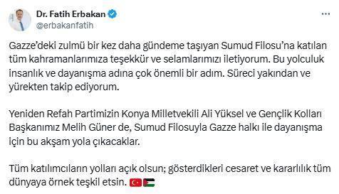 Yeniden Refah Partisi Genel Başkanı Fatih Erbakan, Filistin ile dayanışma ve İsrail'in ablukasını kırma amacıyla yola çıkan Küresel Sumud Filosu'na katılan gönüllülere teşekkür ve selamlarını iletti.