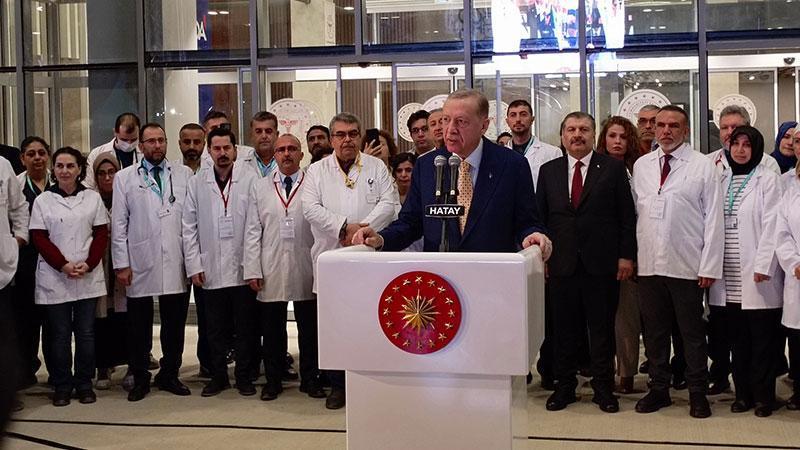 Cumhurbaşkanı Recep Tayyip Erdoğan, deprem konutlarının teslim töreninin ardından Hatay Eğitim ve Araştırma Hastanesi ile İskenderun Devlet Hastanesi Açılış Töreni'ne katıldı. Burada konuşan Erdoğan, "Deprem konutlarının inşası şehrimizin dört bir yanında devam ediyor. Devletimizin tüm kapasitesini adeta deprem bölgesine yığmış durumdayız. Çeşitli sıkıntılarla, meşakkatlerle karşılaşıyor olsak da hedefimizden asla kopmuyoruz. Amacımız mümkün olan en kısa sürede Hatay başta olmak üzere tüm depremzede şehirlerimizi yeniden ayağa kaldırmaktır. Depremin illerimizde ve vatandaşlarımızın gönül dünyasında açtığı yaraları süratle sarmanın derdindeyiz. 6 Şubat'tan bu yana geçen yaklaşık 1 yıllık süreçte bu çabamızdan en küçük bir taviz vermedik. 18-28 Mayıs seçimleri sürecinde birileri buraları kullanışlı siyasi malzeme olarak görürken biz adeta deprem bölgemizin üzerinde titredik. Hükümeti kurduktan sonra kabine toplantılarımızın hemen hepsinde Hatay'da ve diğer vilayetlerimizde devam eden çalışmalarımızı değerlendirdik. Bakan arkadaşlarımızdan aldığımız bilgiler doğrultusunda gerekli talimatları vererek inşa ve ihya sürecinin bugünlere gelmesini sağladık. Depremin ilk safhasını nasıl asrın dayanışmasıyla atlatmışsak, inşallah içerisinde bulunduğumuz süreci de asrın birlikteliğiyle başarıyla yöneteceğiz. Biz millet olarak tarih boyunca nice badirelere göğüs gerdik. Biz her türlü yokluk ve imkânsızlığa rağmen nice destanlar yazdık. Allah'ın izniyle bu meşakkatli dönemin üstesinden de alnımızın akıyla hep birlikte geleceğiz. Bundan en küçük bir şüphe duymuyorum. Türkiye devleti ve milletiyle bunu başarabilecek kapasiteye fazlasıyla sahiptir" dedi.