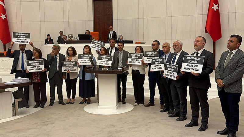 Hakkari Milletvekili Parlak'ın ardından, 'Belediyeler bizimdir, gaspa izin vermeyeceğiz' yazılı dövizleri ellerinde taşıyan DEM Parti milletvekilleri kürsüyü işgal etti. Meclis Başkanvekili Gülizar Biçer Karaca'nın uyarılarına rağmen vekiller kürsüyü terk etmedi. Bunun üzerine birleşime 10 dakika ara verildi. AK Parti, MHP, İYİ Parti ve Saadet Partili milletvekilleri Genel Kurul salonundan ayrılırken, CHP'li milletvekilleri ise yerlerinde bekledi.
