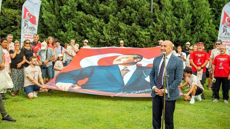 Başkan Soyer, 400 kilometrelik tarihi yolculuk boyunca taşınacak ve son durağı 9 Eylül'de İzmir'de düzenlenecek kurtuluş törenleri olacak Türk bayrağını, Türkiye Dağcılık Federasyonu Yönetim Kurulu Üyesi Siyami Çetin'e teslim etti.