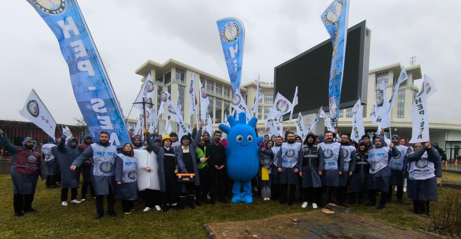 HEP-SEN üyeleri, ataması yapılmayan sağlık çalışanları için Sağlık Bakanlığı önünde bir araya gelerek basın açıklaması yaptı. Sağlık çalışanları, mesleklerini yapamadıkları için farklı işlerde çalışmak zorunda kaldıklarını anlatan dövizler taşıyıp, sloganlar attı. Bazı katılımcılar ise çalışmak zorunda kaldıkları meslekleri temsilen şoför, sanayi işçisi, çoban ve madenci kıyafetleri giydi.