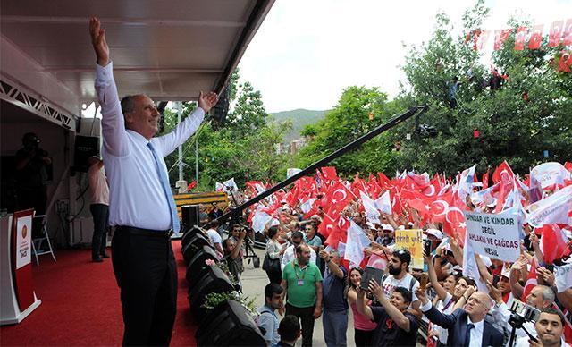 CHP'nin cumhurbaşkanı adayı Muharrem İnce Türkiye'de FETÖ'nün giremediği tek ilin Tunceli olduğunu bir kez daha anladığını söyledi. İnce, "FETÖ'cüler, darbe yapmak istedi. FETÖ'nün giremediği tek Tunceli. KHK ile burada işten atıyorlar. Moralinizi bozmayın, kaç gün kaldı ki; moralinizi bozmayın. Türkiye özgür olacak, Munzur özgür akacak. Hiç merak etmeyin, her gittiğim yerden tekrarlıyorum, bir kez de buradan tekrarlıyorum. Siyaset uzun ince bir yol. Uzun kısmı bitti, ince kısmındayız şimdi. Meydanlarda diyor ki; bak geçim sıkıntısı var, mutfakta enflasyon yüzde 30, milletin tenceresine et girmiyor. Gel bunları konuşalım, cari açık 55 milyar doları geçti, gençlerin yüzde 50'si işsiz. Gel seninle istediğin bir TV kanalında yüreğin, bilgin, cesaretin varsa, gel çık diyorum. En az on yerde tekrarladım, ondan sonra dün cevap verdi; seninle TV kanalına çıkarsa bana reyting yaptırırmış. Çocuklara dedim ki; CNN'e çıktım, Habertürk'e çıktım, şu reytingleri kontrol edin. Erdoğan 11, benimki 44. Dedim ki; şeye bakın hava durumuna bakın. Hava durumu mu izlenmiş, Erdoğan mı? Benim dörtte birim kadar izlenmiş, hava durumu bile Erdoğan'dan fazla izlenmiş. Tunceli'de rakibime sesleniyorum, reytingi ben sana katarım. Benim 4'te birim kadar izlenmiş, gel benimle TV'ye çık da havan olsun biraz. Korkma sen dünya lideri değil misin? Nasıl dünya lideri bu? Dünya lideriysen gerçekten ne diye korkuyorsun, ben adam yemem tartışacağız. Gel sana anlatayım, Türkiye'de ekonomiyi ne yapacağımızı anlatayım" dedi.