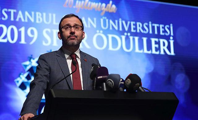 Bakan Kasapoğlu, İstanbul Okan Üniversitesi tarafından düzenlenen "2019 Spor Ödülleri" törenine katıldı. Burada yaptığı konuşmada İdlib şehitlerini anan etkinliğine katılan Bakan Kasapoğlu, İdlib'de insanlığın huzuru için görev yapan Türk askerine muzafferiyet dileyerek, şöyle konuştu: "Bu vesileyle şehitlerimize Allah'tan rahmet, gazilerimize şifa diliyorum. Şehitlerimiz bu vatanının gerçek sahipleri, onlara çok şey borçluyuz. Bu borcu ödemek tabii mümkün değil ama her ne yapıyorsak yaptığımız şeyi en iyi şekilde yaparak onlara layık olmalı, onların canlarını feda ettiği cennet vatana sahip çıkarak, şanlı bayrağı ilelebet payidar kılmanın çabası içinde olmalıyız. Yunus Emre'nin, Eşrefoğlu Rumi'nin, Mevlana'nın, Ahmet Yesevi'nin izini sürenlerdeniz. Bizim askerimiz gittiği yere barışı, esenliği götürmekle meşhur bir asker. İyiliğin, barışın elçisi. Bizim hilalimiz, mazluma umut, sığınak, zalime ise kahredicidir. 'Vefalı Türk geldi yine' diye uğruna marşlar yazılır. Mehmetçiğimiz sahada mazlumların yarasının derdindeyken bize düşen herkesi kardeş bilip, kardeşlik hukukuyla bir olmaktır. Vatanımızın, milletimizin, askerimizin arkasında dağ gibi sapasağlam durmalıyız. Bu aziz millet bu hassasiyete çok güçlü bir şekilde sahip. Cefasıyla vatanperverliğiyle tüm dünyaya örnek olmuş bir millet.”