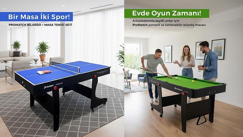Bilardo sporunun daha geniş kitlelere ulaşması, sevilmesi ve özellikle gençlerin sanal dünyadan uzaklaşıp gerçek bir sporla tanışmaları amacıyla tasarlanan ProMatch Portatif Bilardo Masaları aynı zamanda masa tenisine dönüşüyor.