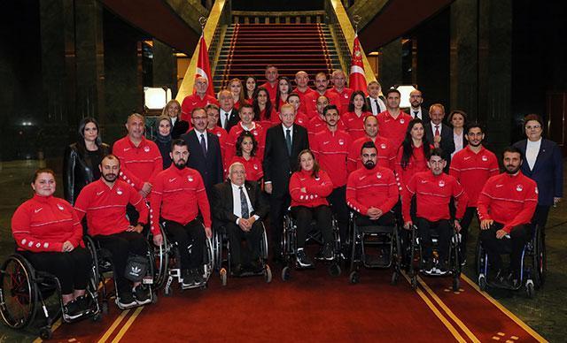 Cumhurbaşkanı Erdoğan, Paralimpik Oyunları'nda madalya kazanan milli sporcuları kabul etti. Cumhurbaşkanlığı Külliyesi'nde gerçekleşen ve yaklaşık 1,5 saat süren kabulde Erdoğan, sporcularla birlikte yemek yedi.