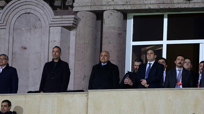 Karşılaşma öncesi Ermenistan taraftarlarının İstiklal Marşını ıslıklamaları hakkında yorumlarda bulunan Büyükekşi, "Biliyorsunuz Ermenistan ile yıllardan beri süren problemimiz var. Az önce de söylediğim gibi yetkililer bizlere güzel bir ev sahipliği yaptılar. Bunlar sportif mücadeleler. İnşallah zaman içerisinde bu sportif mücadelelerle iki halk arasında da barış ortamı oluşur. Çünkü spor biliyorsunuz her zaman söylüyorum Fair-Play, dostluk, barış ve kardeşlik demek. Bunu da bundan sonraki maçlarda bizim hep göstermemiz lazım" diye konuştu.
