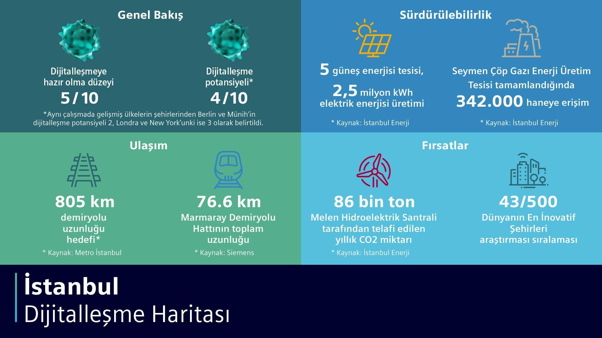 Şehirlerin kentsel sorunlarını çözmek için teknoloji kullanımını inceleyen Siemens, aralarında İstanbul’un da bulunduğu dünyanın çeşitli bölgelerinden şehirlerin dijitalleşme haritasını çıkardı. İstanbul’un 4 ile puanlandırılan dijitalleşme potansiyeli, Londra, New York, Berlin gibi gelişmiş ülkelerin şehirlerinden daha yüksek oldu.