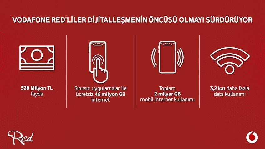 Açıklanan verilere göre, Vodafone Red’liler, son 1 yılda yaklaşık 2 milyar GB mobil internet kullandı, 51,4 milyar dakika konuştu, 2,7 milyar SMS attı. Mobil internet kullanımı 2 yıl öncesine göre 2,5 kat artan kullanıcılar, normal bir faturalı tarife kullanıcısına göre 3,2 kat daha fazla internet kullandı. Aylık ortalama data kullanımı ise 20 GB’ı aştı.