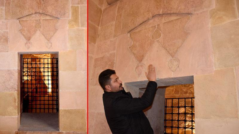 Kabir odası giriş kapısının üzerine sade ama çok şey anlatan bir simge yapıldığını anlatan Ayan, "Burayı kabir odası olarak bırakan Baş Mimar Muğis oğlu Ahlatlı Hürrem Şah, kapı üzerine çok basitmiş gibi gözüken ama maneviyat yüklü bir motif yapmıştır. Bu motifi iki şekilde ele alıyoruz. Üst tarafı tabutun üst kapağıdır. Bunun komplesini bir terazi olarak görünür. Terazinin kefelerinde kalpler tartılmaktadır. Terazilerin orta denge çubuğunda da bir kalp vardır ve o da ters oturtulmuştur, yukarı bakmaktadır. Buradaki tasavvufi mesaj şudur. İçeride yatan merhum ve merhumelerin dili ile 'Biz bu dünyadan göçüp ve gittik. Sizler de göçüp gideceksiniz. Ama bu dünyada yaptıklarımızın karşılığını görebileceğimiz bir yer var. Bu yer ahiret alemi, oraya götüreceğimiz şeyler dünyadaki paramız, malımız, mülkümüz değil, kalplerimiz ve kalplerimizin içerisindekilerdir' anlamı budur. 'İnsan dünyadayken neler yapar? İyilik, kötülük, doğru yanlış, sevap günah gibi hallerde teraziyi bir hal üzerine tutun, kalbiniz her daim Allah'a yönelik olsun. O zaman ölmekten korkmayın, girin kabre' mesajı verilmiştir" diye konuştu. (DHA)