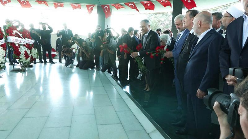 Anma programında konuşan İçişleri Bakanı Ali Yerlikaya, "Eylüller hazan aylarıdır. 17 Eylül tarihi ise sararıp toprağa düşen yaprakların aksine zorla hayattan koparılan üç şehidimizi anımsatır bizlere. Üç demokrasi şehidimizi vefatlarının 62’inci yıl dönümünde dualarla andığımız merhum Başvekilimiz Adnan Menderes ile dava arkadaşları merhum bakanlarımız Fatin Rüştü Zorlu Beyefendi ve Hasan Polatkan beyefendiye Allah'tan rahmet diliyorum. Bugün düzenlediğimiz bu tören sadece bir yastan ibaret değil. Bugün bizler merhum Adnan Menderes'in manevi huzurunda 27 Mayıs'ın, 12 Eylül'ün, 15 Temmuz'un tüm darbe ve ihanet kalkışmalarının karşısında dimdik durduğumuzu, tüm dünyaya ilan ediyoruz. Bu hain saldırılar sadece iktidar hırsıyla hareket eden cuntacıların basit bir kalkışması değildi. Milletimizin istiklal ve istikbaline devletimizin bekasına kurulmuş pusulardı. Ülkemiz ne zaman ilerleme istikametine girse kirli ve karanlık odaklar harekete geçti ve piyonlarını sahneye sürdü hep. İşte, merhum Adnan Menderes dönemi, Tek parti rejiminden sonra 1950 Yılında ‘Yeter söz milletin’ diyerek iktidara gelen Demokrat Parti çok kısa bir zaman içinde büyük ekonomik kalkınma hamlelerinin altına imzalar attı" dedi.