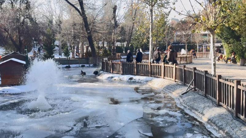 Başkentte kar yağışının ardından hava sıcaklığı gece eksi 11 dereceye kadar düştü. 3 gündür süren soğuk hava nedeniyle süz havuzları ve göller buz tuttu. Gölbaşı ilçesindeki Mogan Gölü'nün yüzeyi de soğuk havanın etkisiyle buz tuttu. Gölde oluşan buz tabakasının üzerindeki kuşlar dikkat çekti. Ankara'nın simgelerinden Kuğulu Park'taki havuzda oluşan buz tabakası da belediye görevlileri tarafından kırılarak temizlendi. Havuzdaki kuğu ve ördekler, görevlilerin buzdan temizlediği alanlarda yüzdü. Meteoroloji Genel Müdürlüğü verilerine göre Ankara'da hava sıcaklığının bugünden itibaren artması bekleniyor. (DHA)