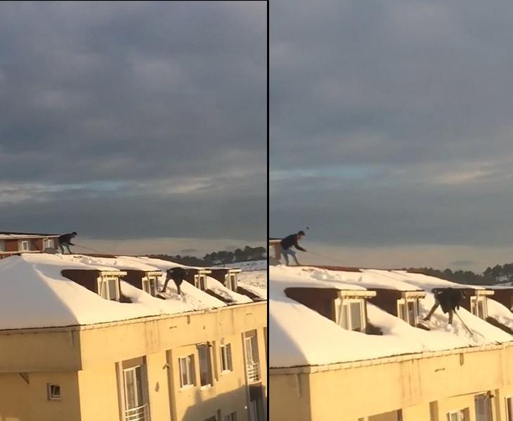 KAR yağışının ardından İstanbul'da binaların çatılarında temizlik çalışması yapanlar  tehlikeli anların ortaya çıkmasına sebep oluyor.  Kar yağışının en yoğun yaşandığı ilçelerden biri olan Arnavutköy'de vatandaşların hiçbir güvenlik önemli almadan bina çatılarında kar temizliği yapması görenleri şaşkına çevirdi. Arnavutköy Merkez Mahallesi'nde 5 katlı binanın çatısını temizleyen 2 kişiyi görenler o anları cep telefonu kamerasıyla görüntülendi. Çatının ön bölümüne kadar gelen kişinin beline bağladığı ipi arkada bulunan kişi tutarak önlem alması dikkat çekti.