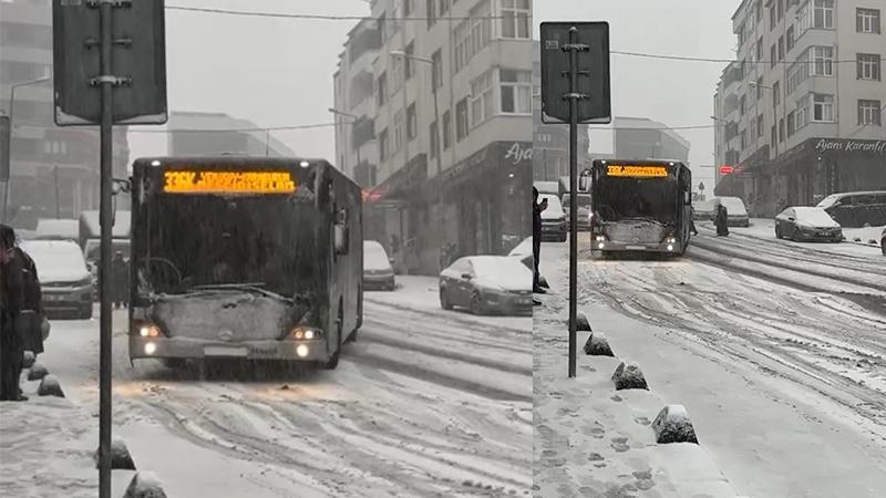 İstanbul'da etkili olan kar yağışı sürücülere zor anlar yaşatıyor. Arnavutköy Osmangazi Caddesi'nde durağa yanaşmak isteyen İETT otobüsü caddede kaydı. Durakta bekleyenlerin yaşadığı panik anları cep telefonu kamerasıyla kaydedildi.