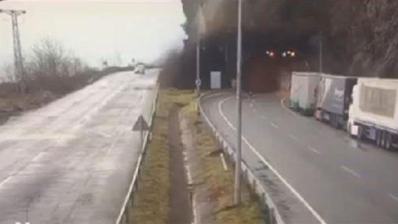 Artvin'de Kopmuş Tüneli girişinde meydana gelen heyelan anı, Karayollarına ait güvenlik kamerasınca görüntülendi. Görüntüde, TIR'ların park halinde olduğu tünel girişindeki yamaçtan heyelanla hızla kopan kaya parçaları ve toprağın yolu kapadığı, ardından da çevreyi toz bulutu kapladığı görülüyor.