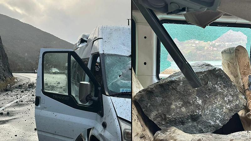 01:00Sinem Ünsal sanal medyada beğeni topladıOlay, sabah saatlerinde Artvin-Borçka kara yolunun İbrikli mevkisinde meydana geldi. Yamaçtan kopan kaya düştüğü yolda ilerleyen sürücüsünün ismi ve plakası bilinmeyen minibüse isabet etti. Kaya, ön koltuklarında 3 kişinin bulunduğu minibüsün tavanını parçalayarak yolcu koltuğu üzerine düştü. Araçta arka koltuklarda yolcu olmaması olası can kaybı ve yaralanmamın önüne geçti. Bir süre ulaşama kapanan yolda, ekipler önlem alarak iş makineleriyle temizlik çalışması başlattı. Çalışmaların tamamlanmasının ardından yol yeniden kontrollü olarak ulaşıma açıldı.