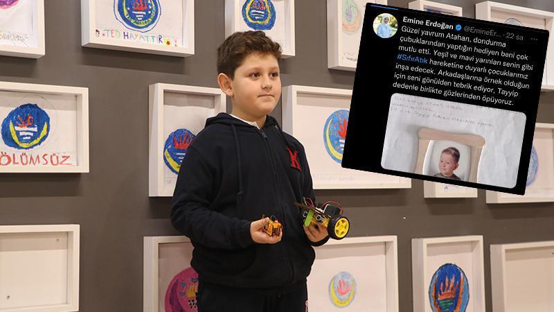 Emine Erdoğan ise aldığı hediyeyi “Güzel yavrum Atahan, dondurma çubuklarından yaptığın hediyen beni çok mutlu etti. Yeşil ve mavi yarınları senin gibi Sıfır Atık hareketine duyarlı çocuklarımız inşa edecek. Arkadaşlarına örnek olduğun için seni gönülden tebrik ediyor, Tayyip dedenle gözlerinden öpüyoruz” notuyla sosyal medya hesabından paylaştı.