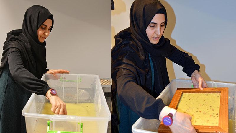 Üniversitedeki birimlerden toplanan atık kağıtlar, küçük parçalara bölünüp, derin bir kap içerisinde ılık suyla birlikte hamurlaşması için bir gün süreyle bekletiliyor. Hamurlaşan kağıtların yapıştırıcı özelliği kaybolması sebebiyle yine geleneksel bir yönteme başvuruluyor. Nişasta ve su kullanılarak hazırlanan sıvı, yapıştırıcı olarak hamur haline gelmiş kağıt kabına aktarılıyor. Çırpıcı yardımıyla kağıt parçacıkları ve yapıştırıcı sürekli karıştırılıyor. Çam ağacından üretilmiş ahşap bir çerçevenin üzerine çelik malzemeden yapılmış elekli kalıp, bu sıvıya eğimli bir şekilde daldırıp çıkarılıyor. Eleğin üzerinde kalan kağıt, pamuk mamulden bir bez parçası üzerine yerleştiriliyor. Kağıttaki fazla suyun alınmasından sonra, pamuk bezle çamaşır gibi asılarak kurumaya bırakılıyor. Ortalama 8 saat sonra kuruyan bu kağıt, pamuk bezden dikkatlice ayırarak ağırlık altında bir süre bekletiyor. Bu işlemden sonra A4 ve A5 ebatlarında oluşturulan kağıt kullanıma hazır hale getiriliyor.