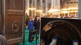 00:38Fatih'te karaya oturan yük gemisi kurtarıldıVakıflar Genel Müdürlüğü Ayasofya Camii'nin İmparator Kapısı'nın onarıldığını açıklamıştı. Ayasofya Kebir Camii ve Külliyesi'nin 154 güvenlik kamerası, 68 güvenlik görevlisi ve turizm polisleri ile en üst seviyede titizlikle korunduğuna dikkat çekilen açıklamada, "Oluşan tahribatta bir güvenlik zafiyeti söz konusu değildir. Ancak takdir edersiniz ki müze statüsünde iken 18-19 bin bandında olan ziyaretçi sayısı camiye dönüştürülmesi ile 40-45 binleri bulmaktadır. Dünya mirası, UNESCO eseri ayrıca Fatih Sultan Mehmet Han'ın vakfiyesi ile bizlere emaneti, mimarlık tarihinin en büyük ve önemli yapılarından olan Ayasofya, 1484 yıldır nasıl ayakta kaldı ise geleceğe de aynı ihtişamı ile bir mabet olarak taşınacaktır" denilmişti. Onarılan kapı bugün görüntülendi. Kapının önünde bariyer olduğu görüldü.