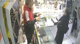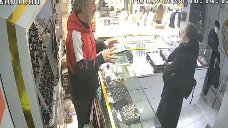 Soygun anı iş yerinin güvenlik kamerasıyla kaydedildi. Görüntülerde, şüphelinin kuyumcuya 'çabuk doldur nakitte koy' diyerek silah doğrultması ve kuyumcunun sahibinin şüpheliye 'sakin ol' diyerek altınları doldurduğu anlar yer aldı. (DHA)