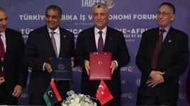 01:362 kardeşi yaralayan pitbullun sahibi: Köpeğim koruma içgüdüsüyle saldırdıTicaret Bakanlığı ev sahipliğinde düzenlenen Türkiye-Afrika İş ve Ekonomi Forumu (TABEF), İstanbul Kongre Merkezi'nde sürüyor. Ticaret Bakanı Ömer Bolat, Libya Mutabakat Zaptı'nın imza törenine katıldı. Bakan Bolat, Libya Ekonomi ve Ticaret Bakanı Muhammed Huveyc, Libya Ulaştırma Bakanı Muhammed Salim eş-Şehubi ile JETCO ve Müteahhitlik mutabakatı imzaladı.